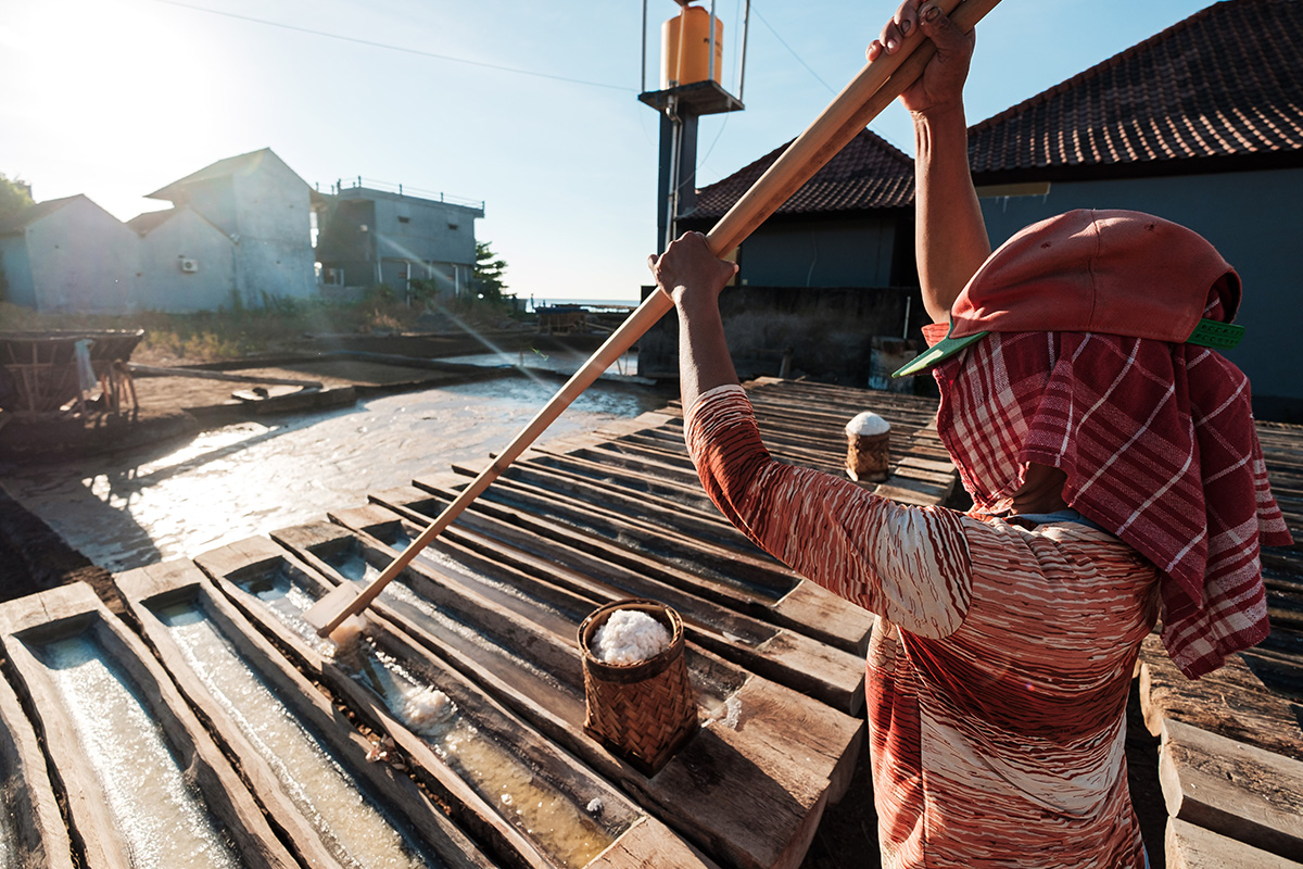 Uyah Amed is an organic Balinese sea salt. What makes this particular salt different from other salts lies in its process. Still adhering to traditional ways, Balinese sea salt is produced by evaporating them manually with sunlight. Saltwater is filtered about three to four times, then put under the sun in a traditional container made from a coconut tree. Later, the crystalized saltwater will be picked up with a coconut shell.