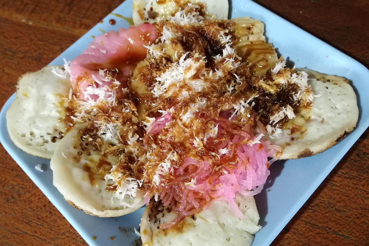 Serabi is an Indonesian pancake that can be found across the archipelago, and Bali has their own ways of making this traditional dessert. Known as jaja laklak, this version of serabi is made with different ingredients from its Javanese counterpart. Jaja laklak is made from rice flour mixed with water and natural dyes, such as suji (Dracaena angustifolia) leaves. This chewy cake is also served with melted brown sugar known as kinca and a sprinkle of grated coconut.