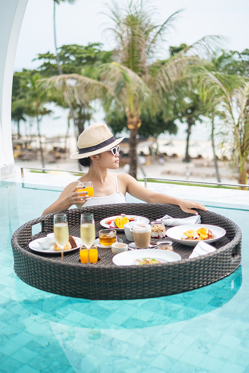 除了漂浮果盘,许多酒店还可将早餐也做成漂浮早餐。想象一下,清早起来,和爱人跃进泳池,再来一顿漂浮早餐,是不是无比舒服惬意?