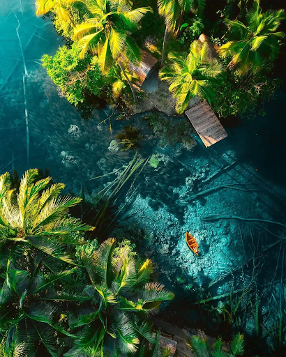 邦盖岛上,最先出圈的当属黑水湖(Paisu Pok Lake),不要被它的名字误导,“ Paisu Pok”在邦盖语中的意思是“黑色的水”,也是因为湖水太清澈,有些湖底植物会使湖面反射出黑色。然而,大多数时候它是松石般的湛蓝色。