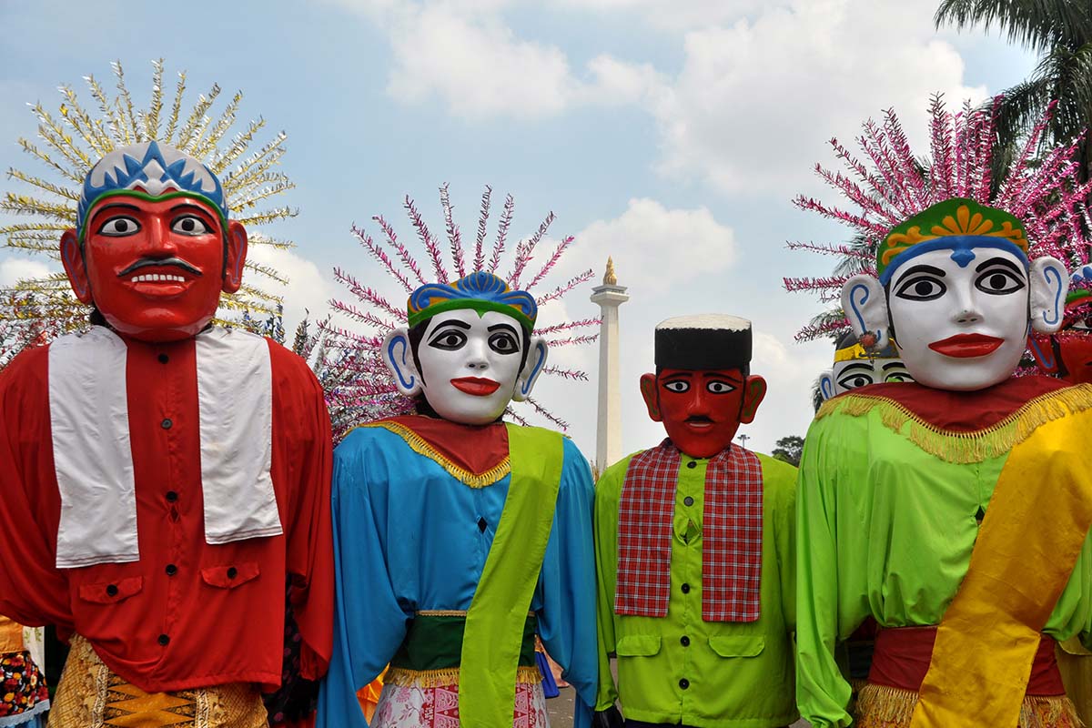 Ondel Ondel is a large puppet figure featured in Betawi folk performance of Jakarta. It is utilized for livening up festivals or for welcoming guests of honor, usually in pairs. And it is one of a few Indonesian folk performances that has survived modernization and is still being regularly performed. The musical accompaniment for Ondel Ondel performance varies with regions, occasions and groups of performances. And yes, it is the icon of Jakarta and Betawi culture!