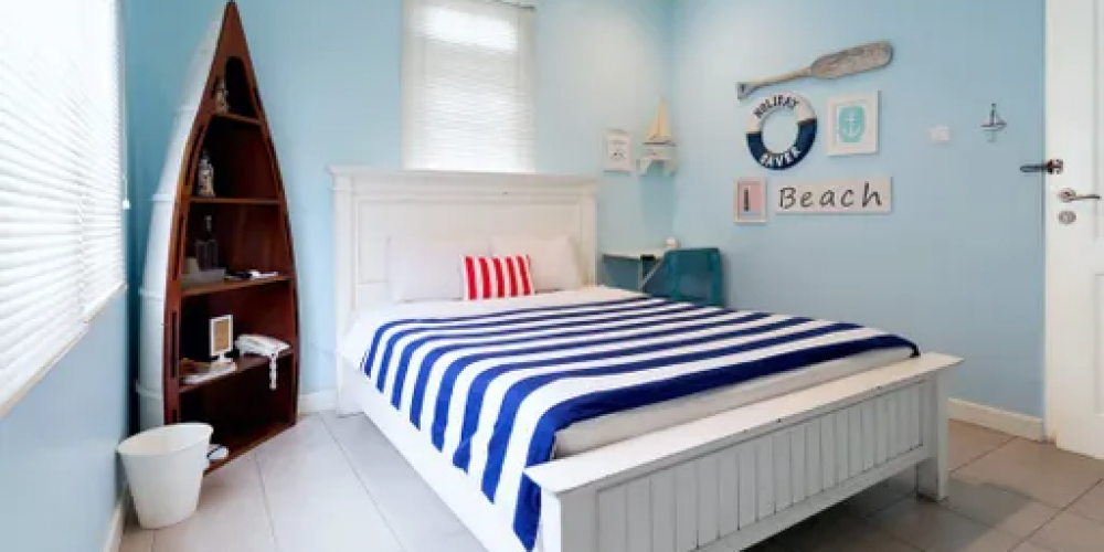 Tipe kamarnya ada double bed, twin bed, dan family room. Setiap kamar juga punya konsep yang berbeda-beda. Salah satunya tema kamarnya Poople Room, dengan seprai putih garis-garis biru yang memberi kesan nautical. Di samping tempat tidur juga dilengkapi rak buku yang dibuat dari perahu. Harga kamarnya mulai dari Rp 325.000,- per malam.