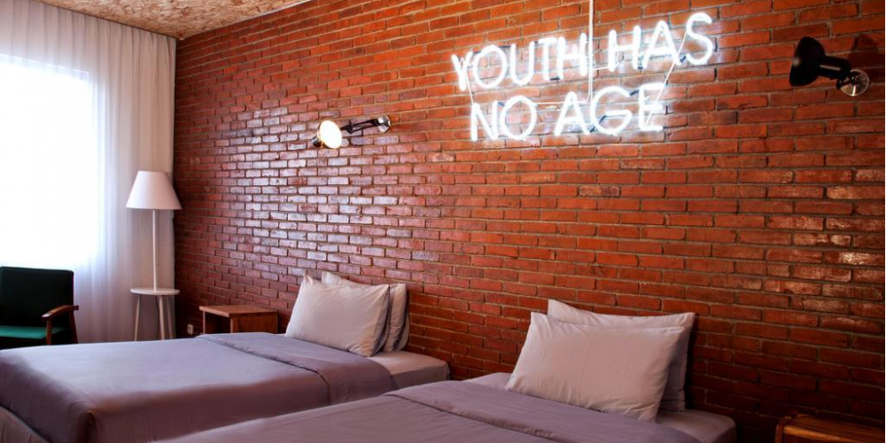 Tembok hotel ini dihiasi dengan motif-motif unik dan artsy, cocok untuk foto-foto buat konten media sosial kamu. Harga hotel juga terjangkau, mulai dari Rp 255.000,- per malam.