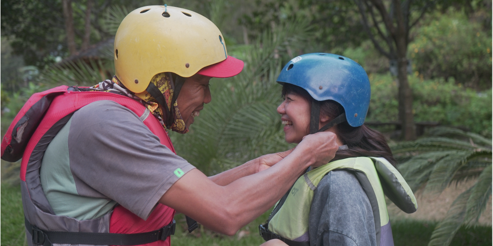 Sebelum memulai aktivitas river tubing, para pemandu memastikan semua peserta mengenakan perlengkapan keselamatan seperti helm dan jaket pelampung, serta mengikuti safety briefing. Setelah itu berjalan kaki melewati jalan setapak menuju titik start.