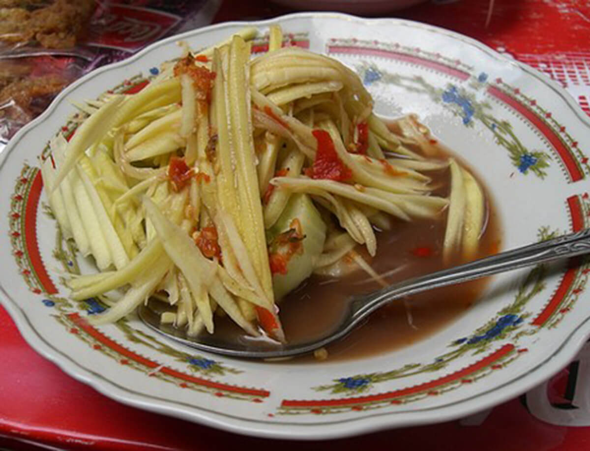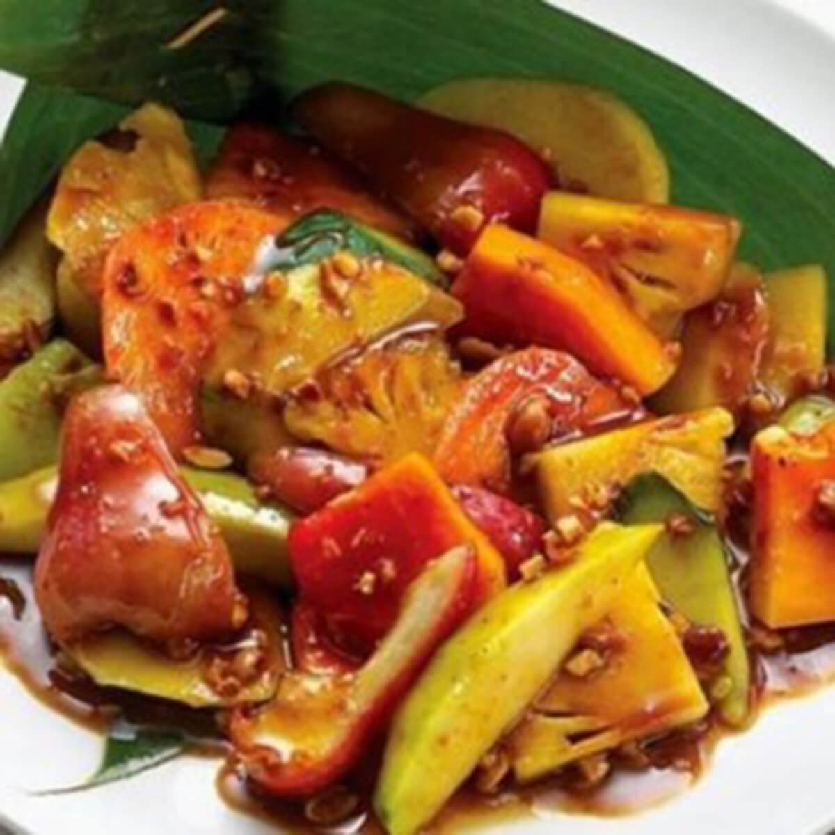 バリ島から少し旅をしてみると、ロンボク島の別の休日の天国、そしてもちろん、その特別なルジャク、すなわちルジャク・テラス(rujak terasi)があります。東ジャワではエビのペーストはペティスと呼ばれ、ロンボクネとインドネシアのほとんどの人はテラシとして知られています。テラスは、鳥の目の唐辛子と混ざっているので、赤いソースに作られています。この赤いソースは、ブラウンシュガーのグレービーと混ぜ合わせて、様々な新鮮なフルーツスライスのミックスに注ぎます。