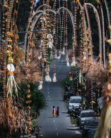 家家户户门口也会摆放蓬葭,高高的蓬葭象征着教义 智慧,垂下来的稻穗则寓意谦虚低调。蓬葭下面摆放 的贡品形状类似火山,因为巴厘人认为,神灵住在高 处,而阿贡火山(Agung)是巴厘岛最高的地方,但 是人们不能到火山顶祭拜,所以做了类似火山形状的 贡品台,以像火山高处的神灵致敬。