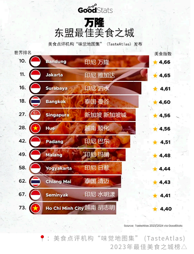 万 隆 , 是 “ 东 南 亚 第 一 美 食 城 ”。 在 美 食 点 评 机 构 “味觉地图集” (TasteAtlas) 2023年最佳美食之城 榜单上,万隆高居东南亚第一名,位列全球第10名!(戳这里复习万隆美食)