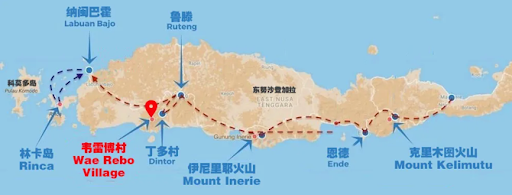 - 首先需从纳闽巴霍(Labuan Bajo)出发,约四个小时的车程,到达鲁滕(Ruteng)或登格村(Denge),登格村距离韦雷博村约70公里,是徒步的起点;