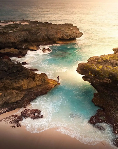 在松巴岛西南部,著名的威库利湖(Weekuri Lagoon)旁边,是大自然鬼斧神工造就的曼多拉克海滩(Mandorak Beach),两座巨大的岩石凹凸相对,仿佛亿万年前断裂开一样,中间是汩汩流动的清澈海水,非常神奇。