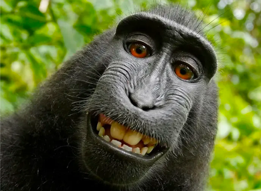 此 外, 这 里 还 有 体 型 最 小 的 猕 猴——黑 冠 猕 猴(black macaque) 。 2014 年, 有 趣 的 “ 黑 冠 猕 猴 自 拍”事件你还记得吗?当时棠果果的一只黑冠猕猴拍 下了这张“自拍”照, 那么这张照片的版权是属于相机 主人还是黑冠猕猴呢?善待动物组织 (PETA)认为版 权应归属猕猴, 但最终裁定,动物不能拥有版权, 于 是这张照片属于公共版权, 所以我们都可以使用, 这张照片也在摄影史上留下了一笔。