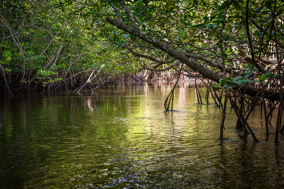 现在的红树林河道两旁露出缠绕而发达的根系,小艇驶入狭窄的地方,甚至伸手便能触摸到岸上的植物。丛林里会遇见珍稀的银叶猴、大蟒蛇、变色龙、蜥蜴、鹰等.