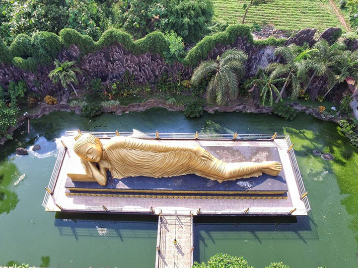 东爪哇Mojokerto(惹班)的 Maha Vihara Mojopahit(两者伯夷大寺)佛院是特洛沃兰(Trowulan)大卧佛的所在地。整个佛院占2万平方公尺地。佛院四周环境优雅安静,空旷的草坪,林木葱绿。面对佛院是座宏伟壮观的庙宇,采用富有爪哇等个的屋顶建筑,结合了印尼和中式庙宇建筑格式,别具一格。庙宇神殿入门道两旁整齐排着众门神雕塑。宽敞的庙宇内供奉着千手观音、弥勒佛、释迦摩尼等佛雕。庙堂后侧凉亭内还供奉着四面佛。佛院神殿右侧佛光四射,大卧佛浮现,让心宁静。