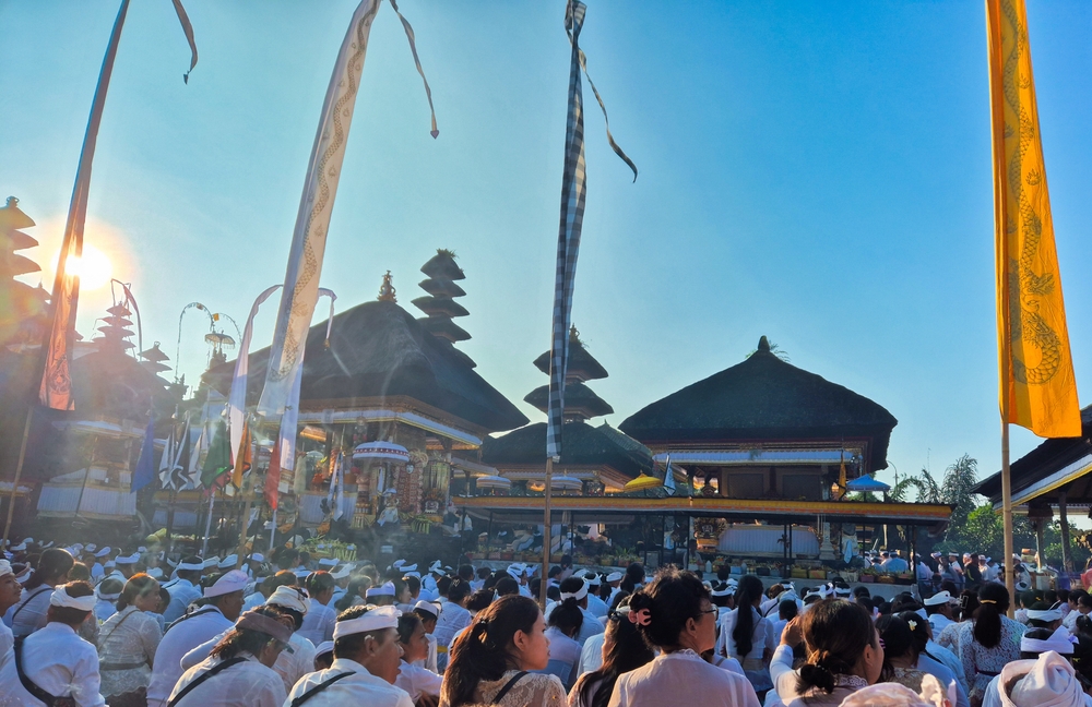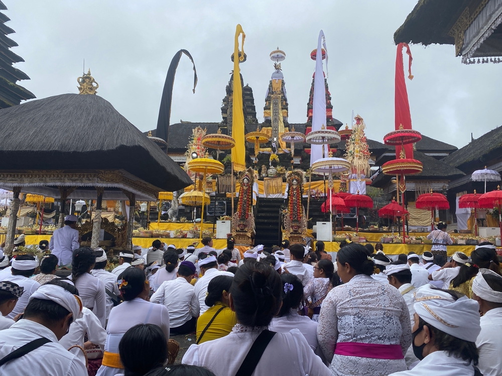 During the ceremony, Balinese Hindus from across the island gather and bring large offerings, including sajen bebangkit and banten agung.