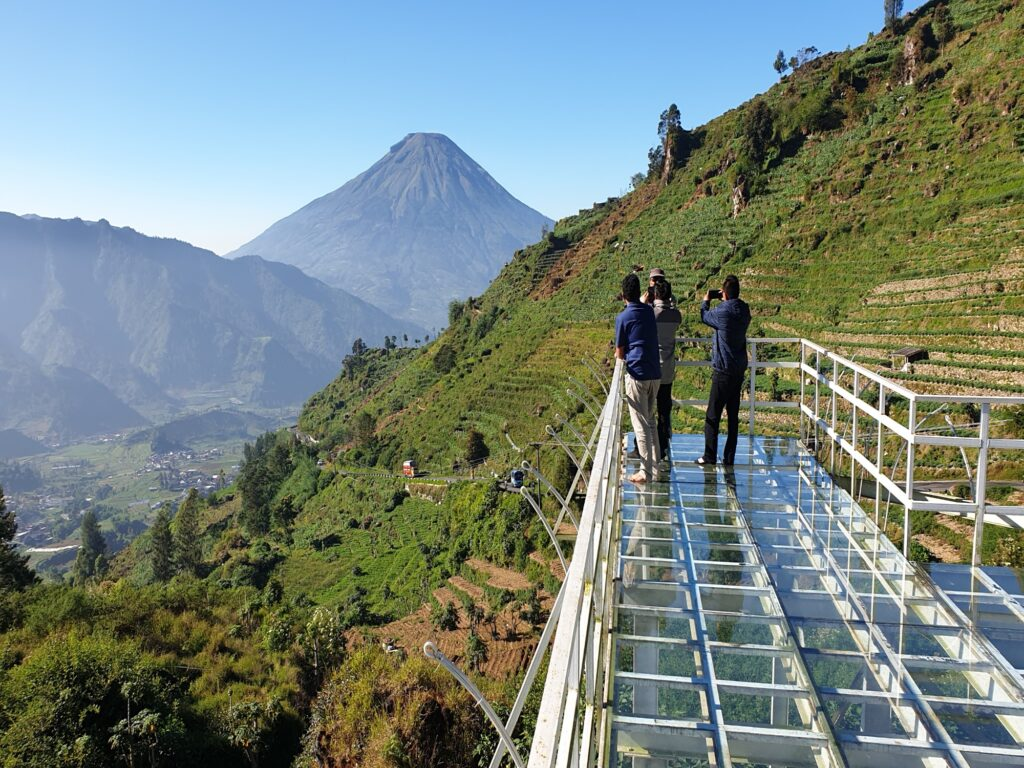 Auf beeindruckenden 2.100 Metern über dem Meeresspiegel gelegen, bietet Maha Sky Batu Angkruk eine der besten Aussichten auf die Panoramen von Dieng. Etwa 21 km vom Stadtzentrum Wonosobos entfernt, ist es ein großartiger Ort, um den Sonnenaufgang zu erleben. Besonders beliebt ist der Ort für seine Instagram-tauglichen Fotospots. Der Höhepunkt ist die gläserne Brücke – ein 50 Meter langer Steg, der scheinbar über die grünen Hügel schwebt und den Besuchern ein spannendes Erlebnis bietet.