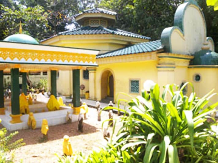 The pride of the island is the Sultan’s Mosque (shown on the left), the Mesjid Raya Sultan Riau Penyengat. Peeping through the palm trees like a fairy tale castle, it is still in use today. Rumour has it that a large part of the mosque was made of eggs, gifts from the Sultan’s loyal subjects on the occasion of his wedding. The egg-white proved to be a strong bonding agent. The mosque has excellent acoustics and even a whisper can carry right across the auditorium. Here is also the beautifully preserved handwritten and illustrated Quran of over 150 years old.