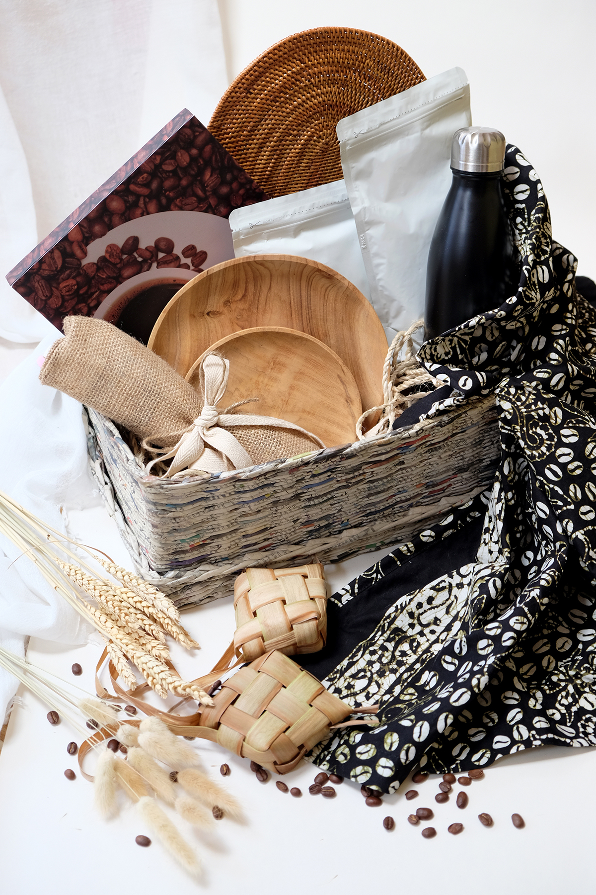 Siapa bilang kalau parsel Lebaran harus makanan? Nggak juga lho. Biar penerima parsel makin terkesan, coba deh untuk memadukan minuman khas Indonesia dengan perlengkapan pendampingnya. Sobat Pesona bisa kirim parsel bertema kopi tradisional khas Indonesia. Kemas isi bingkisan ke dalam kotak dari bahan daur ulang, lalu tambahkan juga dengan nuansa batik berupa taplak, lengkapi dengan tempat minum, perlengkapan makan untuk camilan yang disantap bersama kopi dan buku tentang kopi Indonesia. Jangan lupa sertakan kartu ucapan Lebaran ya, Sobat Pesona!