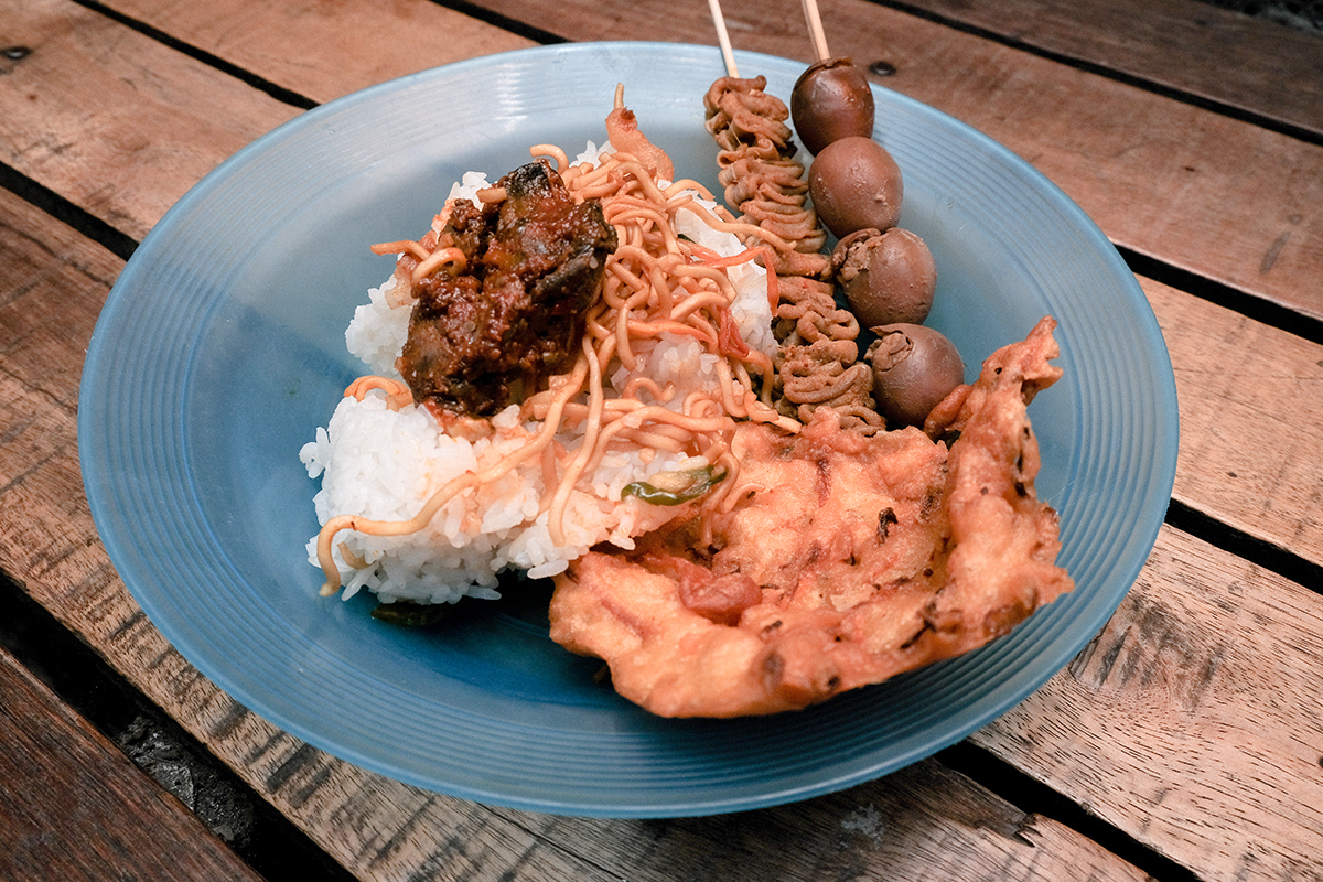 Seporsi nasi tempong berisi nasi, ikan asin, tahu, tempe, lengkap dengan lalapan rebus dan sambal yang super pedas. Ada banyak pilihan lauk lainnya seperti ayam kampung, bebek, lele, dan belut yang bisa jadi penyempurna kenikmatan sepiring nasi tempong.