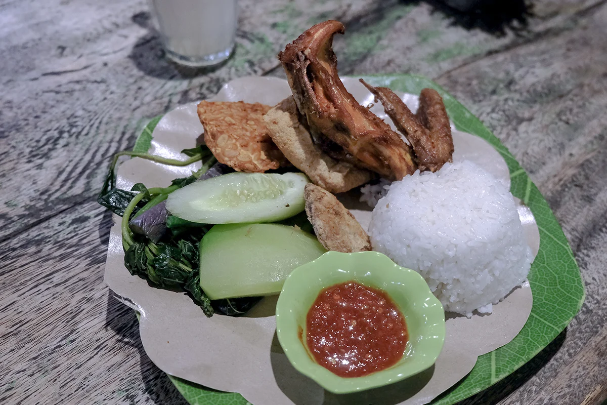 Walaupun berasal dari Banyuwangi, Jawa Timur, menu satu ini ternyata cukup populer di Bali. Nama nasi tempong berasal dari bahasa suku Osing di Banyuwangi yang artinya tampar. Sesuai dengan namanya, sajian ini memiliki sambal yang super pedas sehingga menciptakan sensasi seperti habis ditampar.