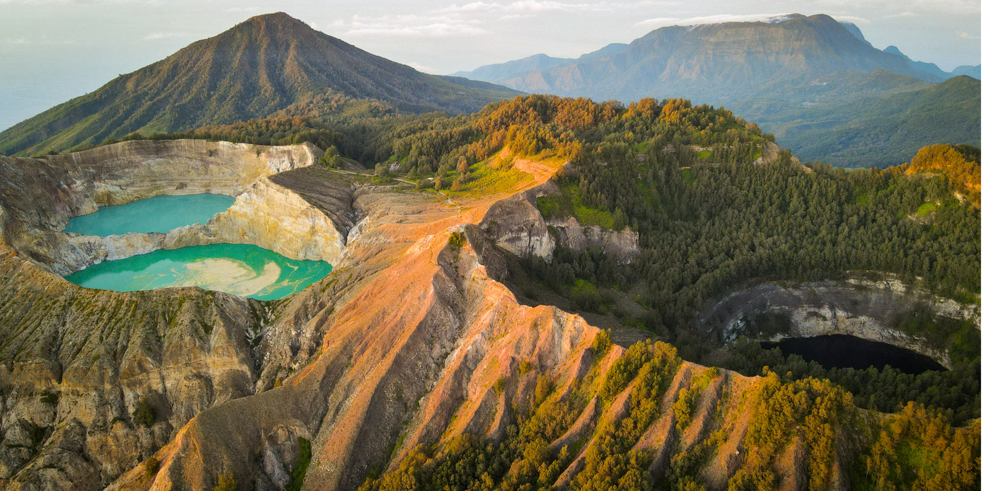 Terdapat tiga danau kawah dengan warna yang berbeda-beda: biru, hijau, dan merah. Perubahan warna ini disebabkan oleh mineral dan gas vulkanik yang ada di dalamnya. Ini adalah salah satu fenomena alam yang paling mengesankan di Indonesia.