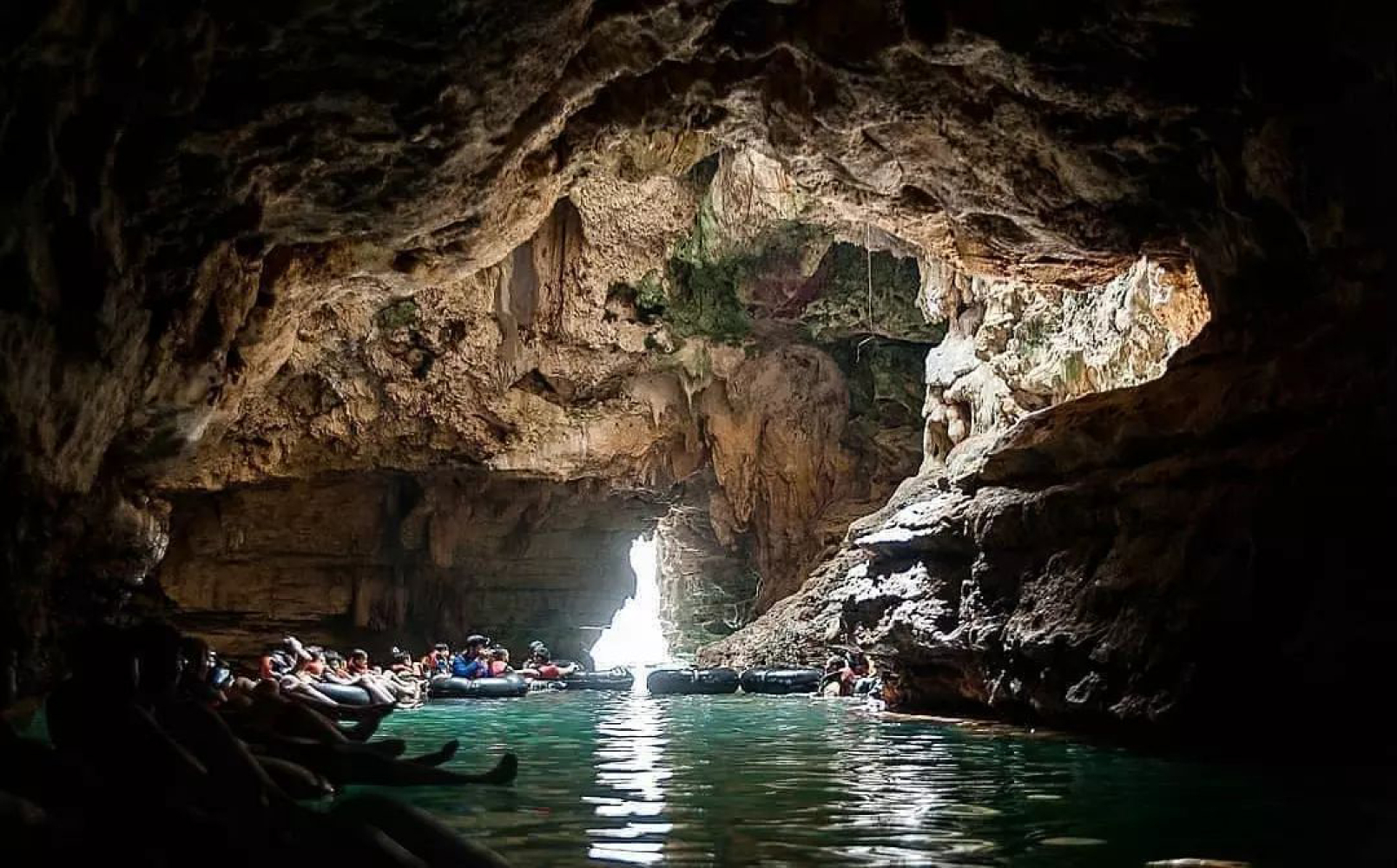 At the cave's base, you'll find a crystal-clear river. You'll then be guided on a float trip to closely appreciate the cave's beauty through this river.