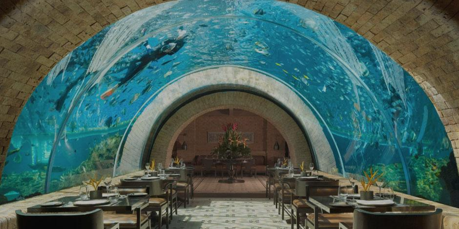 Spot yang paling jadi favorit adalah dining di terowongan akuarium. Sobat Pesona bakal makan sambil lihat biota laut yang lalu lalang di akuarium. Menu yang ditawarkan mulai menu Asia hingga western. Contohnya ada Thai lobster dan le foie grass. Siapa nih yang bakal kamu aja untuk makan di sini, Sob?