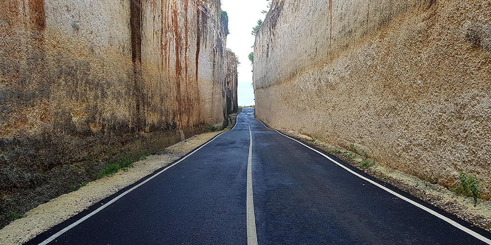 Kamu bisa berpose di tengah jalan yang sepi, dengan latar belakang tebing kapur yang cantik dan indah. Super estetik, deh! Tapi jangan sampai terlalu asyik foto-foto sampai mengganggu kendaraan lain ya, Sob