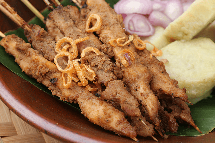 バリから生まれたこのサテーは鶏肉、魚、豚 肉、亀の肉など色々な肉が使われ、主に魚のすり身が使われている。ココナッツとライムジュース、ココナッツミルク、シャロットと混ぜたすり身をくしにつく ねのように棒状に固め、その周りをレモングラスの葉で巻き火の中に入れる。バリに来たら食べるべき一品だ。