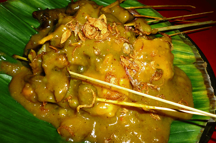 パダン料理のオリジナルである西スマトラのこのサテーは、牛タンや牛肉で作られている。ライムの葉、レモングラス、コリアンダー、しょうが、ターメリックと共にゆでた後、スパイシーなイエローソースに絡める前にグリルで焼き目をつける。