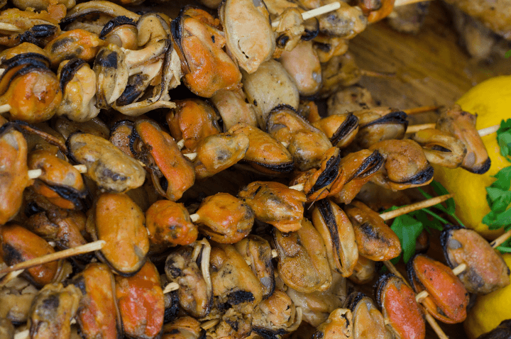 東ジャワのスラバヤに由来し、ホタテをライムの葉っぱ、しょうが、甘い醤油で味付けしたこのカランサテーは、さっと火を通し、焼き目がついたら食べごろだ。