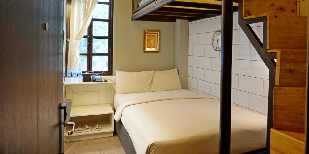 Tipe kamarnya ada double bed, twin bed, dan family room. Setiap kamar juga punya konsep yang berbeda-beda. Salah satunya tema kamarnya Poople Room, dengan seprai putih garis-garis biru yang memberi kesan nautical. Di samping tempat tidur juga dilengkapi rak buku yang dibuat dari perahu. Harga kamarnya mulai dari Rp 325.000,- per malam.