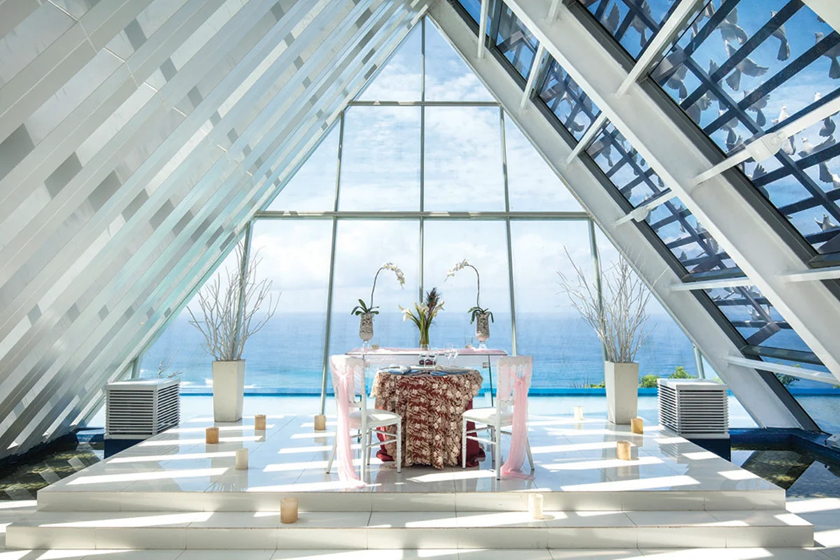 Tempat selanjutnya yang harus Sobat Pesona tahu dapat ditemukan di dalam Mulia Resort, yang letaknya berada di dekat garis pantai Nusa Dua yang cantik. Dikelilingi oleh kolam biru yang memesona sebagai latar belakang pernikahan Sobat Pesona, tempat mewah ini merupakan bangunan berkaca diisi oleh lampu kristal buatan tangan yang melambangkan cinta abadi. Tempat yang menakjubkan ini bisa menampung sebanyak 250 tamu, Sob! Dengan tim khusus yang mampu membuat pernikahan Sobat Pesona seistimewa mungkin, berbagai macam paket pernikahan serta  penyesuaian juga tersedia buat dipilih.