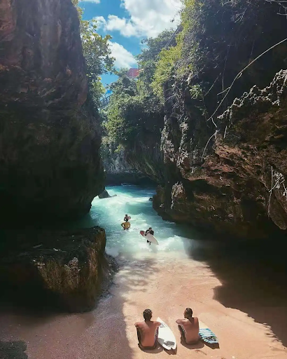 蘇魯班海灘隱藏在天然石灰岩地層之中,可通過岩石中狹窄的石縫臺階和原木坡道進入,非常隱蔽,也決定了它非常小眾,遠離熙熙攘攘的旅行團。壯闊的海浪,讓這裡成為完美的衝浪基地,但是切記,這裡的浪很大,只適合有經驗的專業衝浪人士。