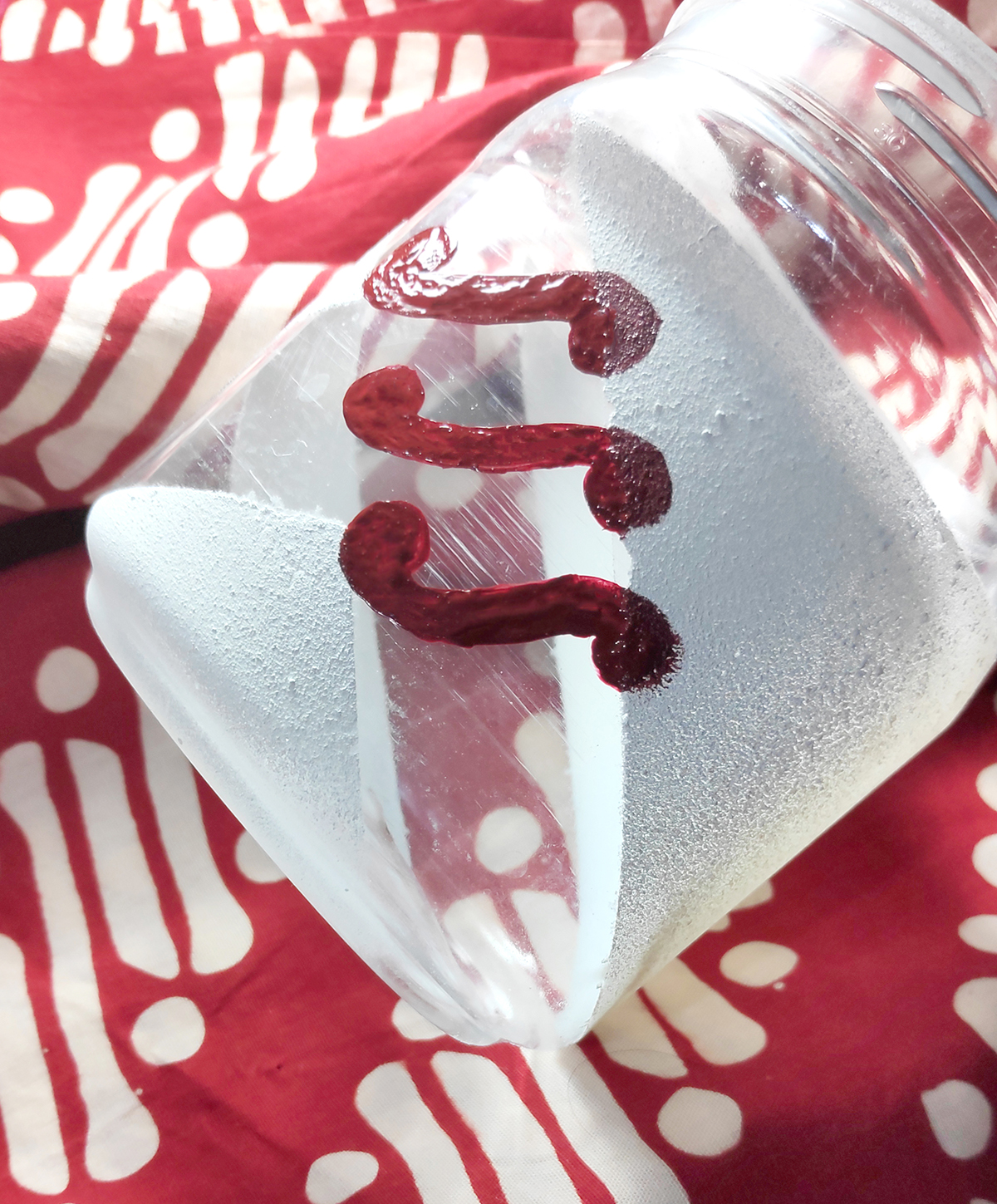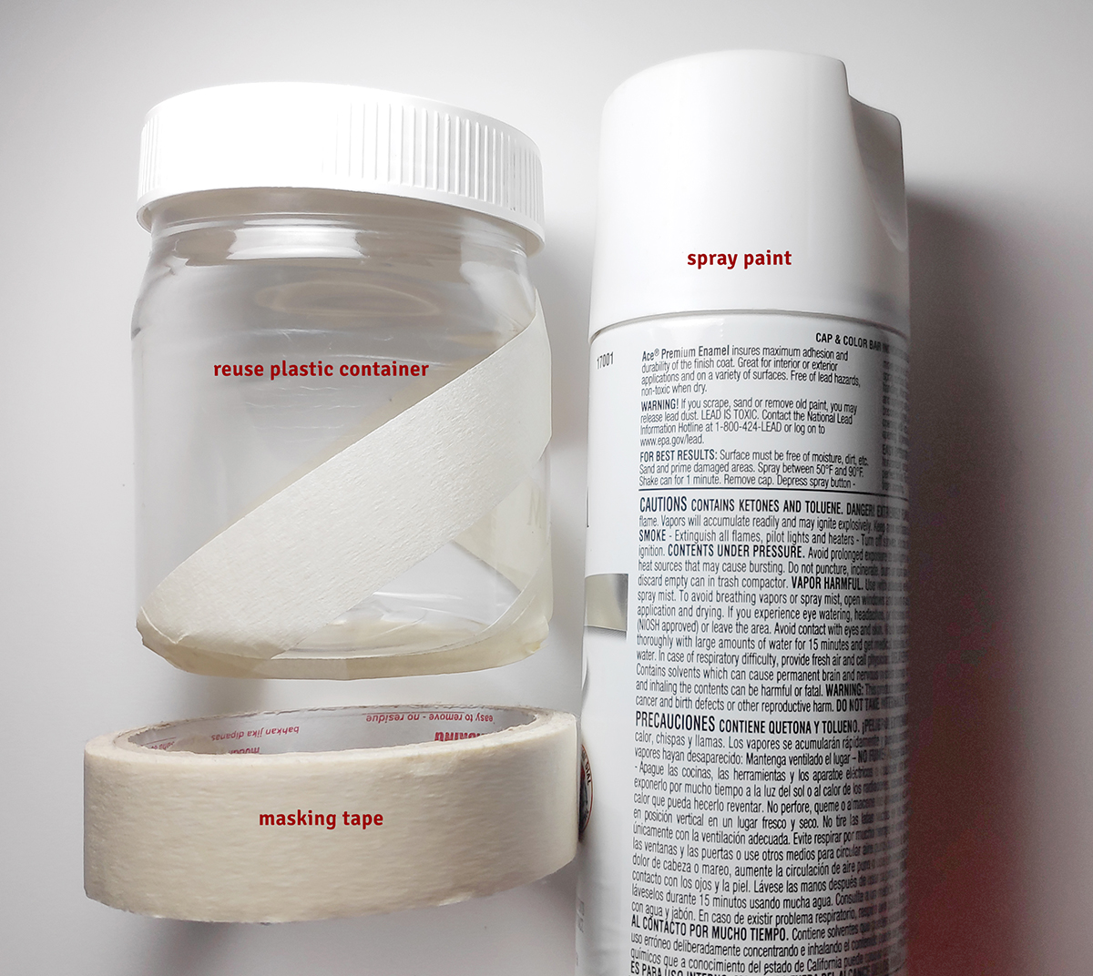 Pertama-tama, bersihkan wadah atau toples, lalu buatlah pola menyilang dan tutupi dengan selotip. Setelah selesai, semprotkan cat putih di area yang tidak terkena selotip dan tunggu hingga kering.