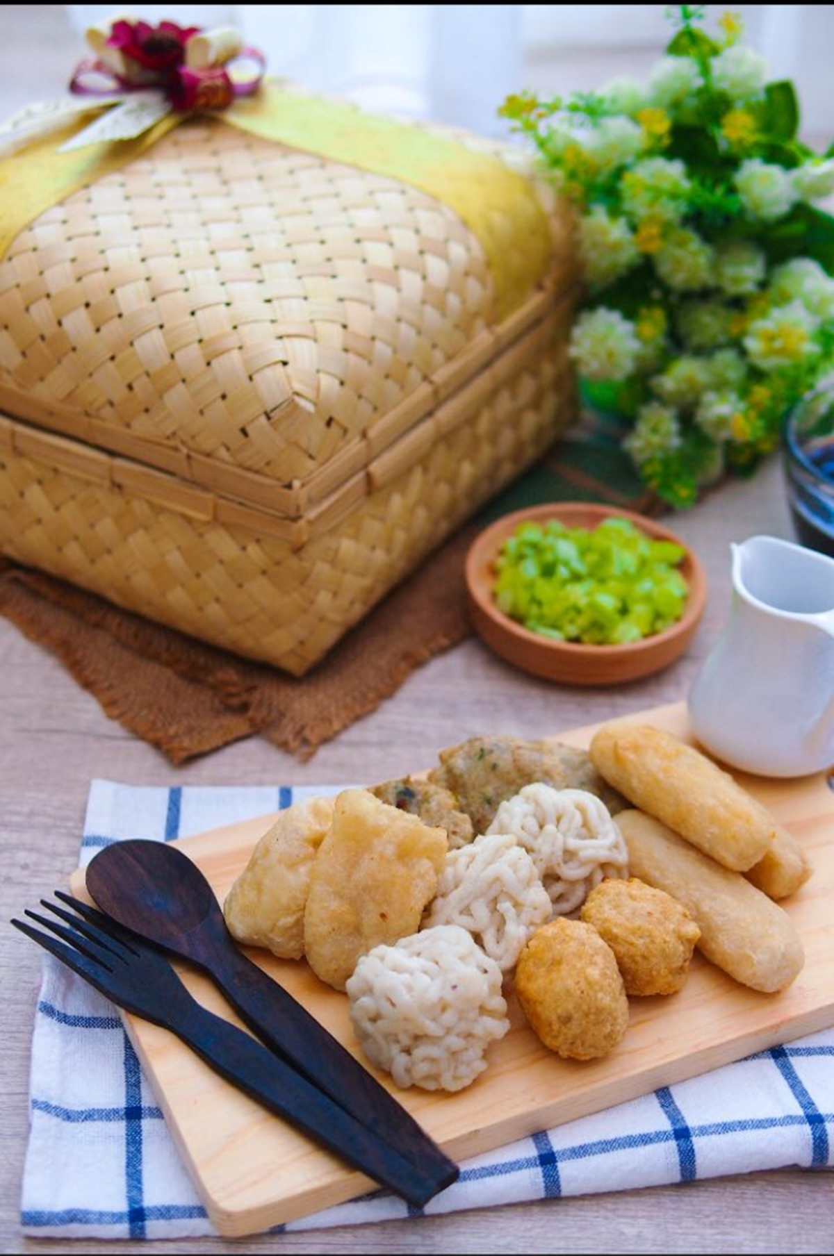 The dough then formed into various sizes and shapes before entering the frying pan full of oil. The food then served with a brownish black sauce called cuko. Cuko is made of boiled water, palm sugar, dried shrimp, mashed bird-eye chilly, garlic and salt. Sometimes sliced cucumber and yellow noodle also served as the garnishes.