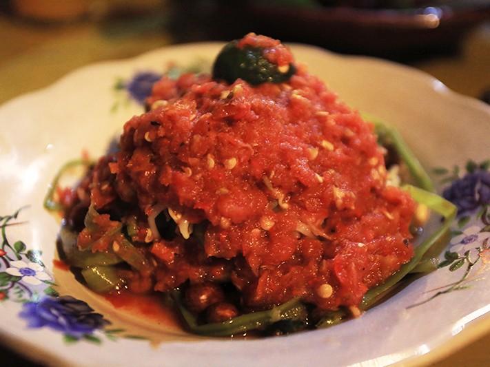 Beberuk is a simple spicy fresh salad consisting of raw vegetables such as long beans, eggplant, and cucumber topped with a fresh tomato sauce. Beberuk is usually considered as a sambal or condiment and is, therefore, mostly served as a side dish with other main dishes.